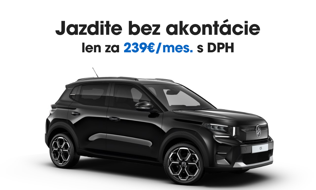 Užívajte si slobodu pohybu s novým Citroënom C3 v bohatej výbave PLUS už za 239 € mesačne s DPH. V rámci operatívneho leasingu na 36 mesiacov s ročným nájazdom 10 000 km získate nielen štýlové vozidlo, ale aj absolútny pokoj na cestách. V pevnej mesačnej splátke máte zahrnuté kompletné poistenie (povinné zmluvné aj havarijné) a plný servis vozidla, takže sa nemusíte starať o žiadne neočakávané výdavky.