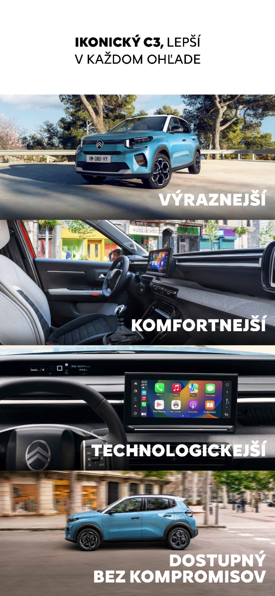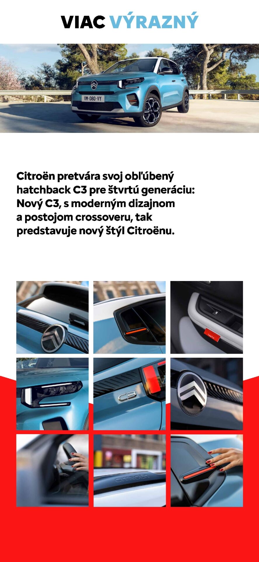 Exteriér novej C3 kombinuje robustný postoj mestského crossoveru so zvýšenou svetlou výškou, novým vertikálnym logom značky a ikonickou dvojfarebnou karosériou BITON, ktorú dopĺňajú moderné ECOLED svetlomety a štýlové vymeniteľné farebné klipy pre jedinečnú personalizáciu.