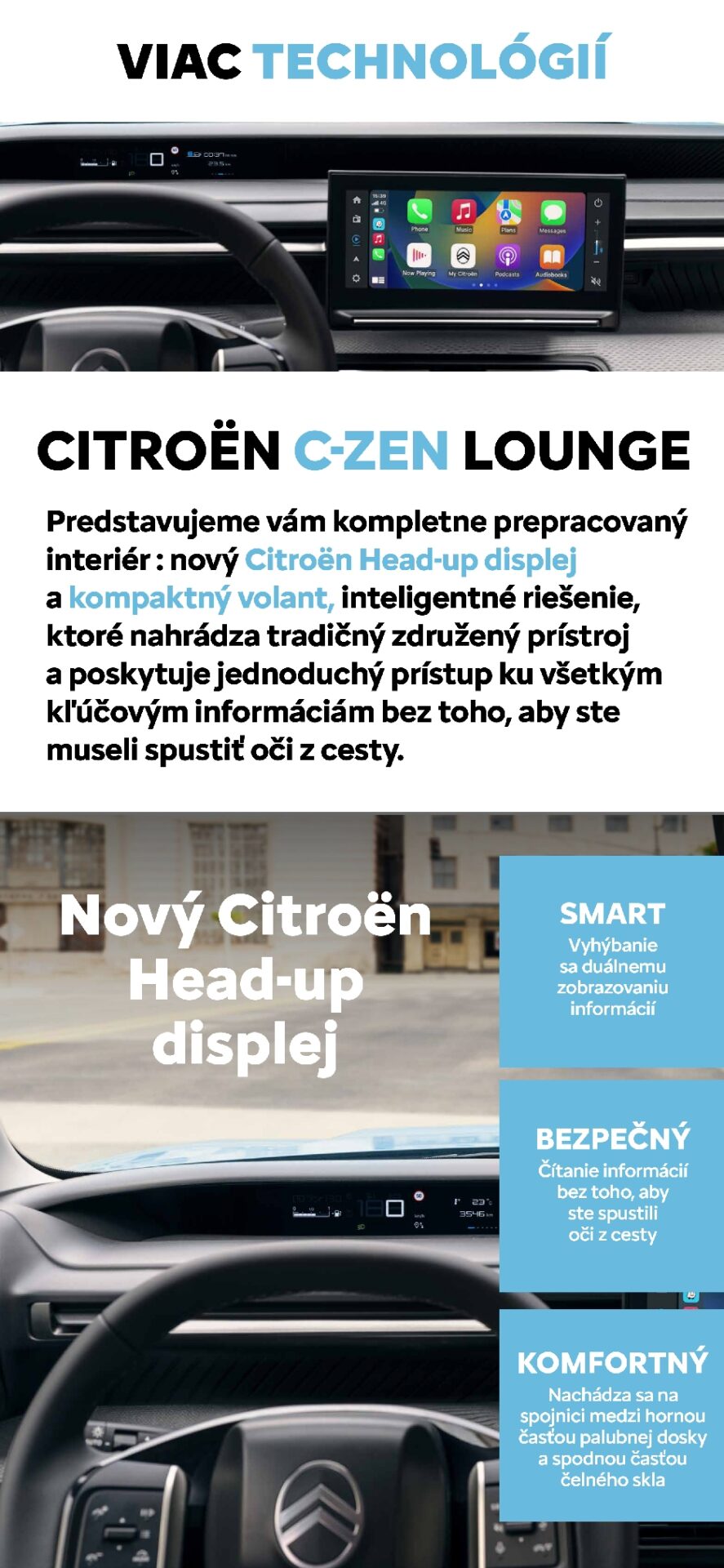 Nový interiér koncepcie C-Zen Lounge prináša revolučný Citroën Head-Up displej namiesto klasických budíkov, ktorý v spojení s ikonickými sedadlami Citroën Advanced Comfort® a vyvýšeným posedom vytvára maximálne priestranný, bezpečný a domácky pôsobiaci priestor pre všetkých cestujúcich.