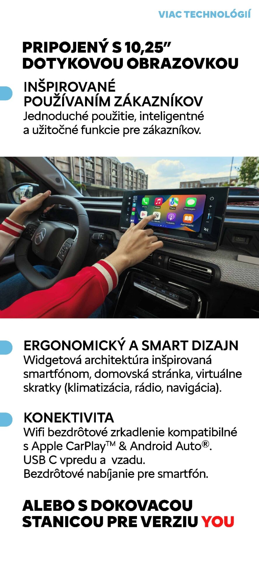 Benzín Turbo 100 S&S, 6-stupňová manuálna prevodovka, 10″ dotykový displej, bezdrôtový Mirror Screen (Apple CarPlay / Android Auto), 3× USB-C, pruženie a sedadlá Citroën Advanced Comfort, manuálna klimatizácia, zadný parkovací asistent, tempomat, Active Safety Brake, rozpoznávanie značiek, ECOLED svetlomety, 17″ disky AZURITE, dvojfarebná strecha BITON, výbava PLUS