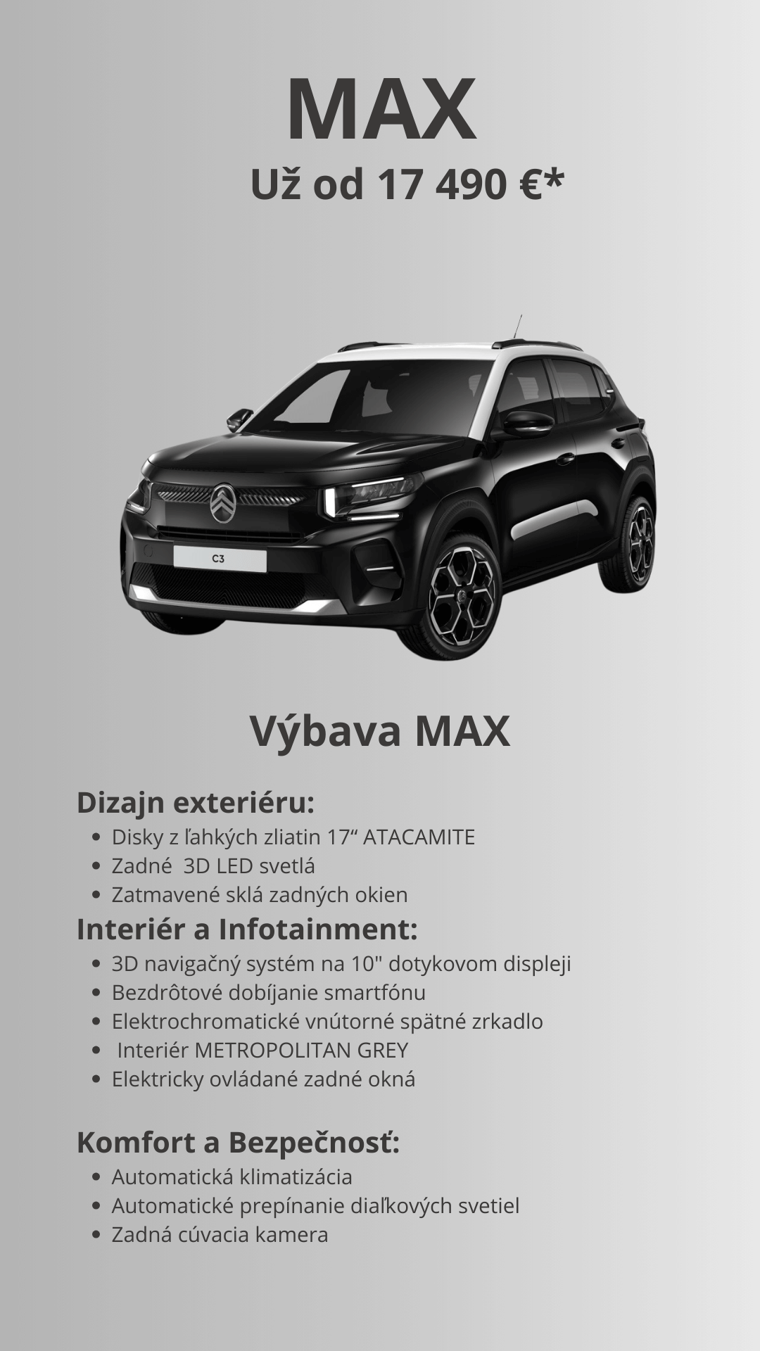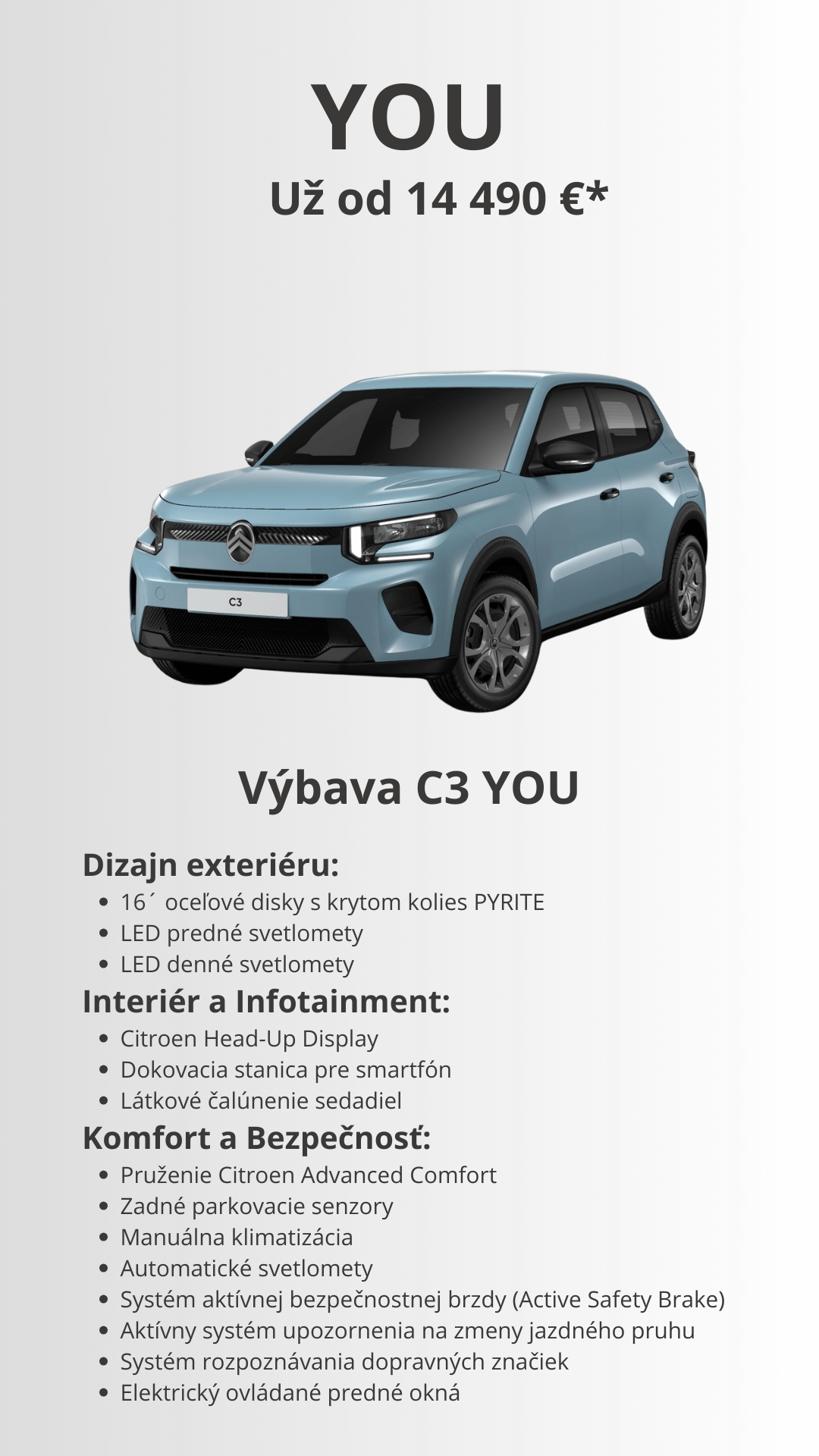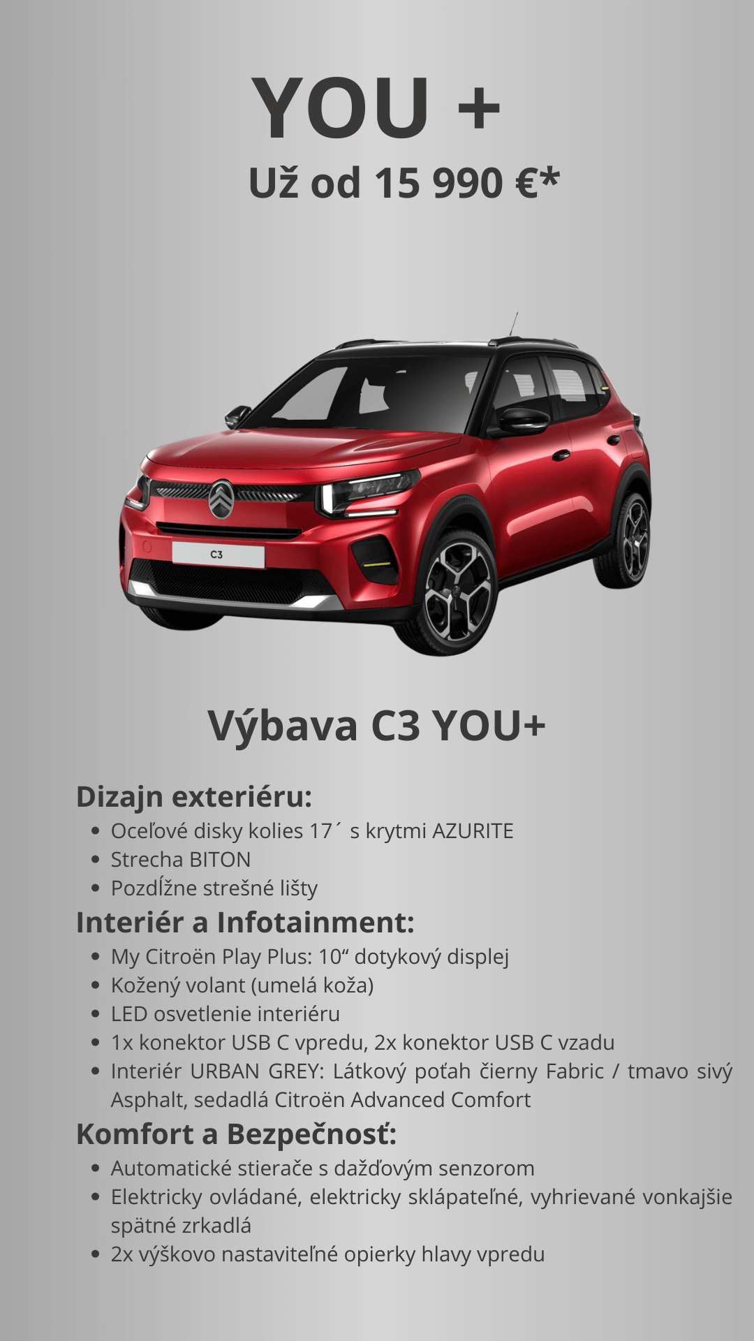Ikonický C3, ktorý ste si zamilovali, je v porovnaní s predchádzajúcou generáciou lepší vo všetkých smeroch: inovatívny, moderný a inteligentný. Jedinečný a robustný dizajn, výrazný komfort na palube a užitočná výbava pre každodenné jazdy.